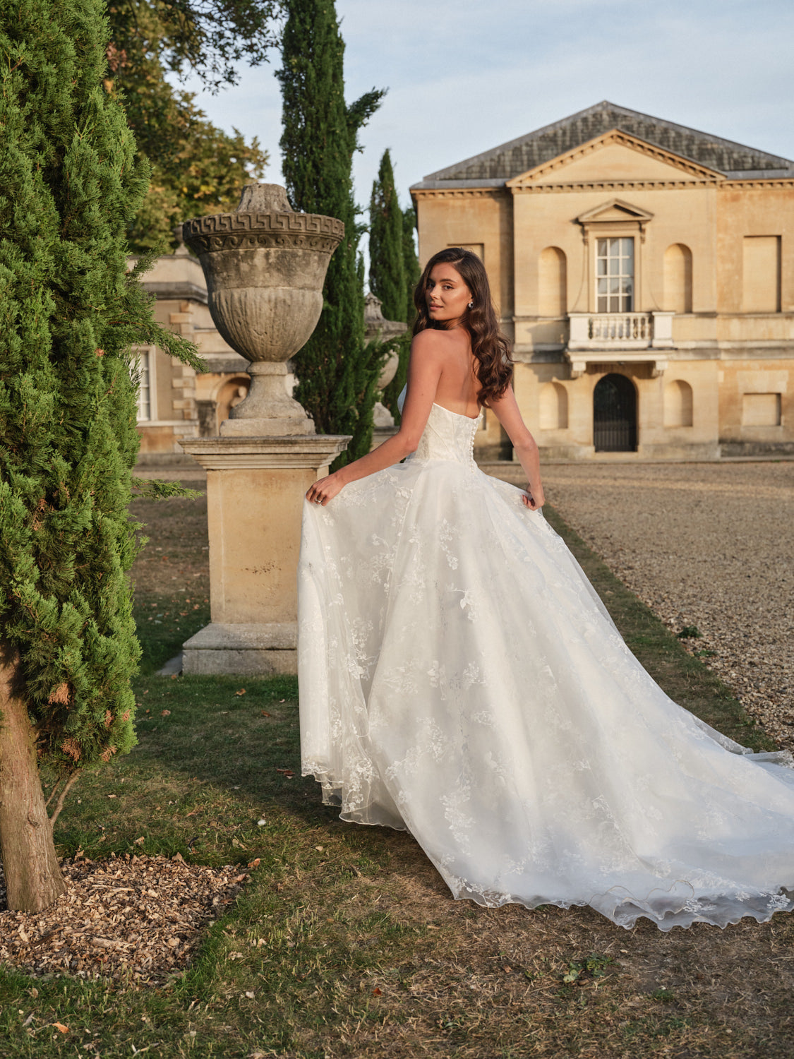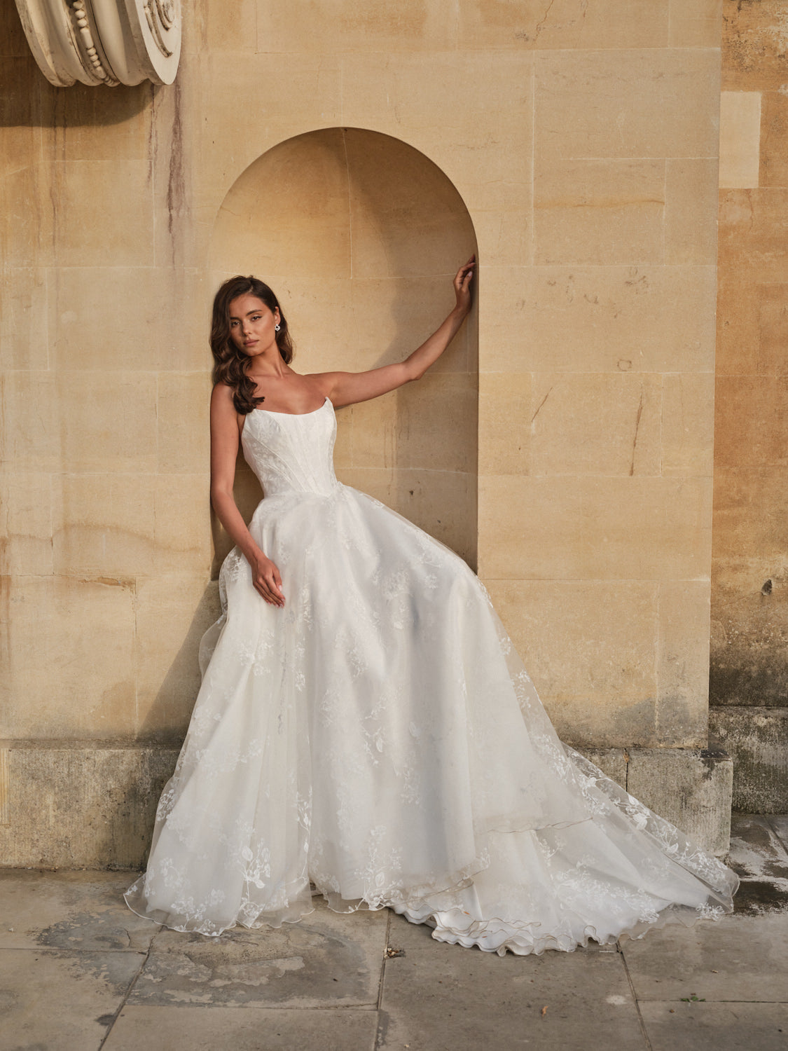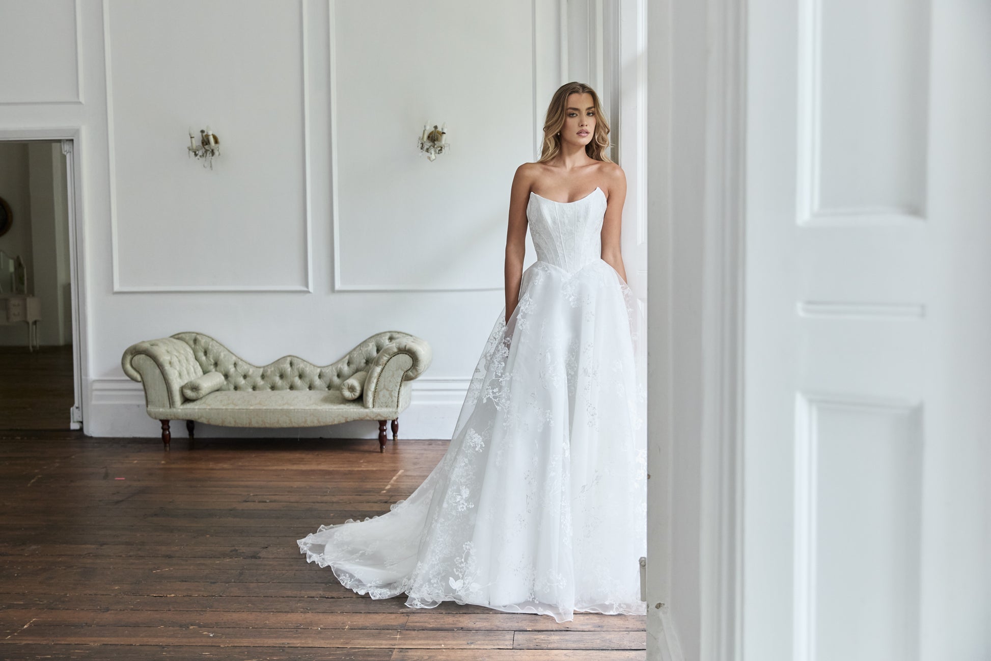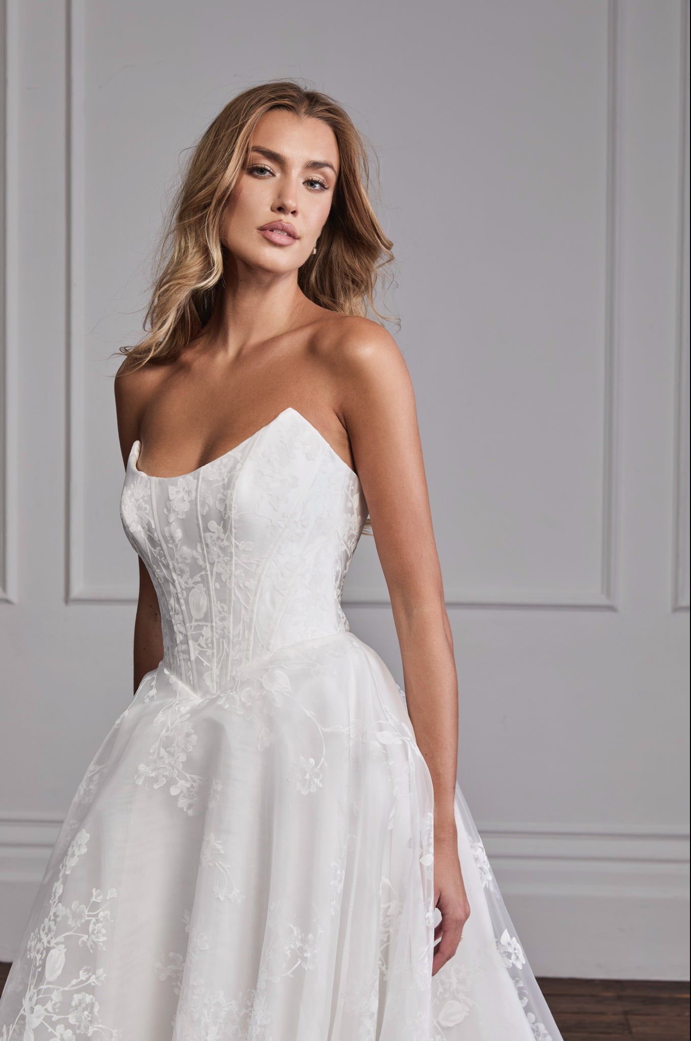 From Suzanne Neville’s latest Everlasting Grace Collection, the Celeste gown is an unforgettable design that combines timeless craftsmanship with couture detailing. Featuring Suzanne’s iconic scoop neckline and basque waistline, Celeste is designed to enhance the figure with her signature structured corsetry, creating a beautifully feminine silhouette.