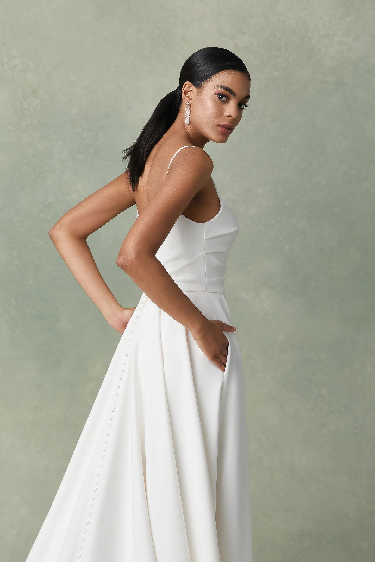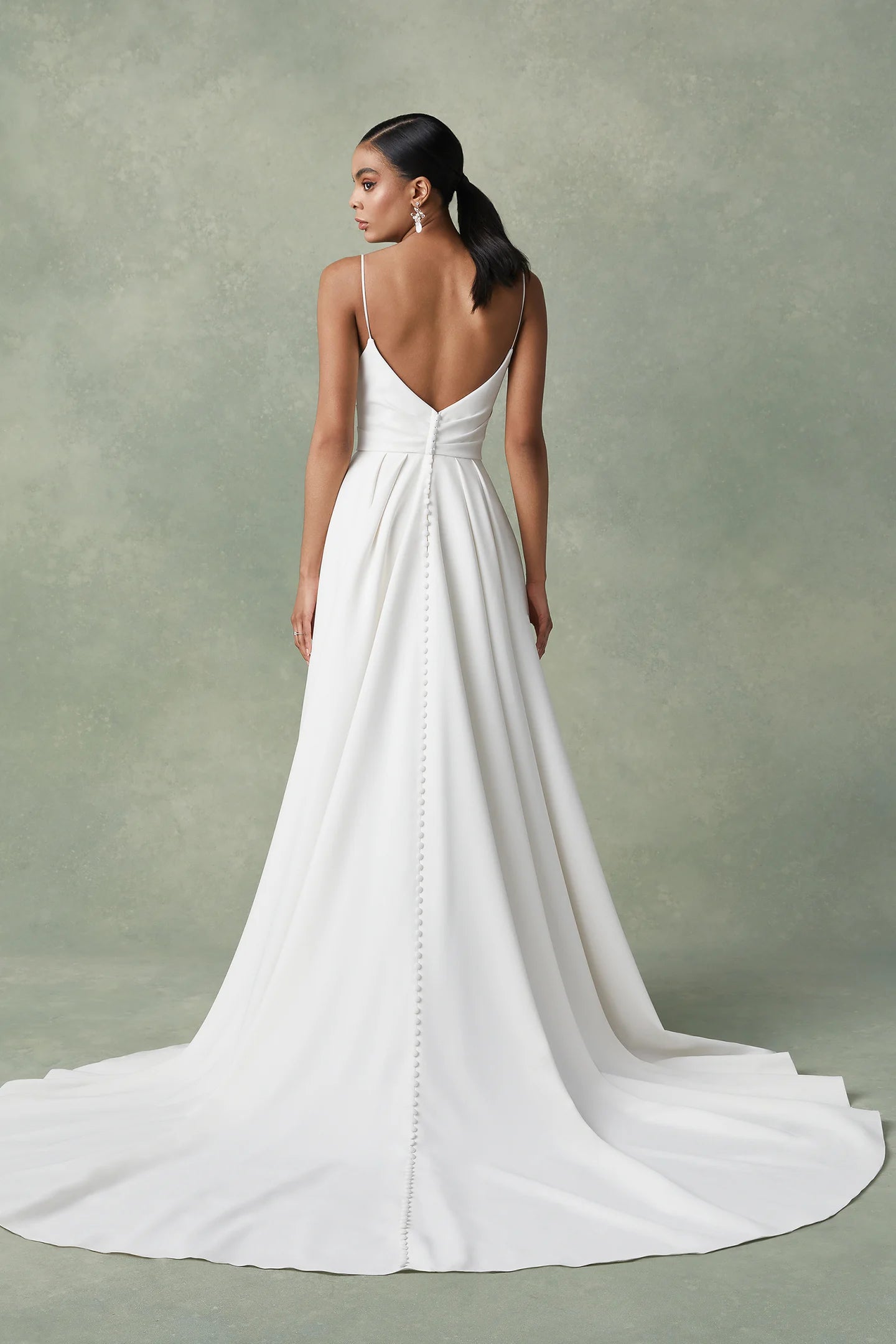 The beauty of Frankie lies in her refined minimalism allowing the bride to shine while creating a look that feels both timeless and fashion-forward. Delicate covered buttons trace the entire length of the back, adding a touch of classic detail to this otherwise contemporary design.