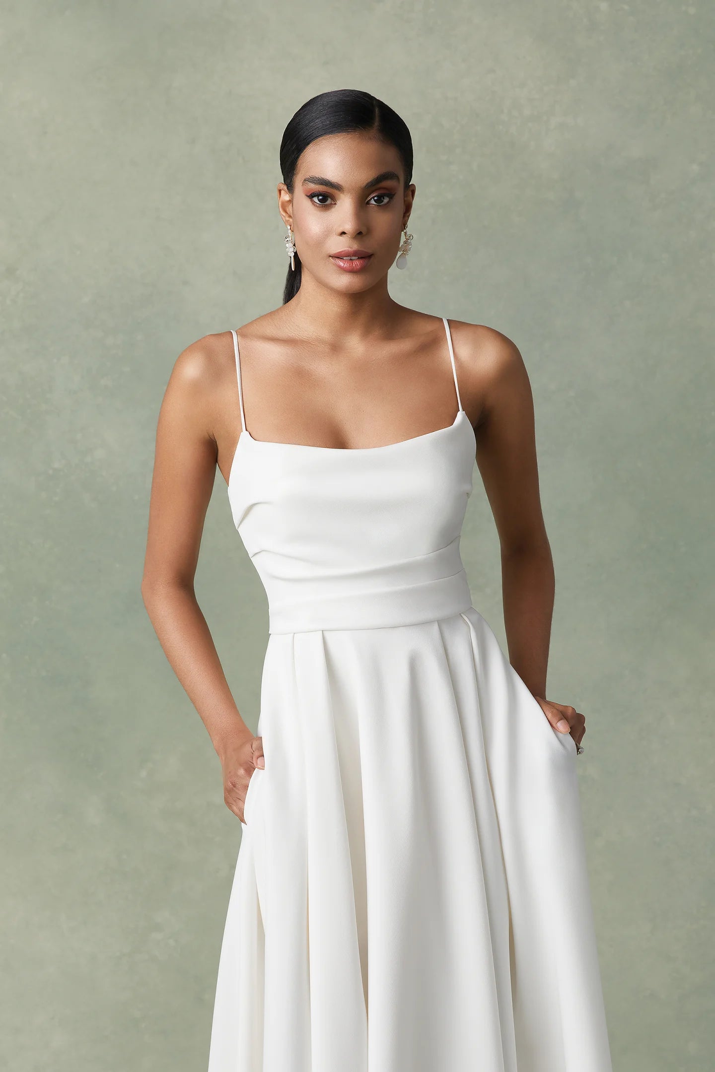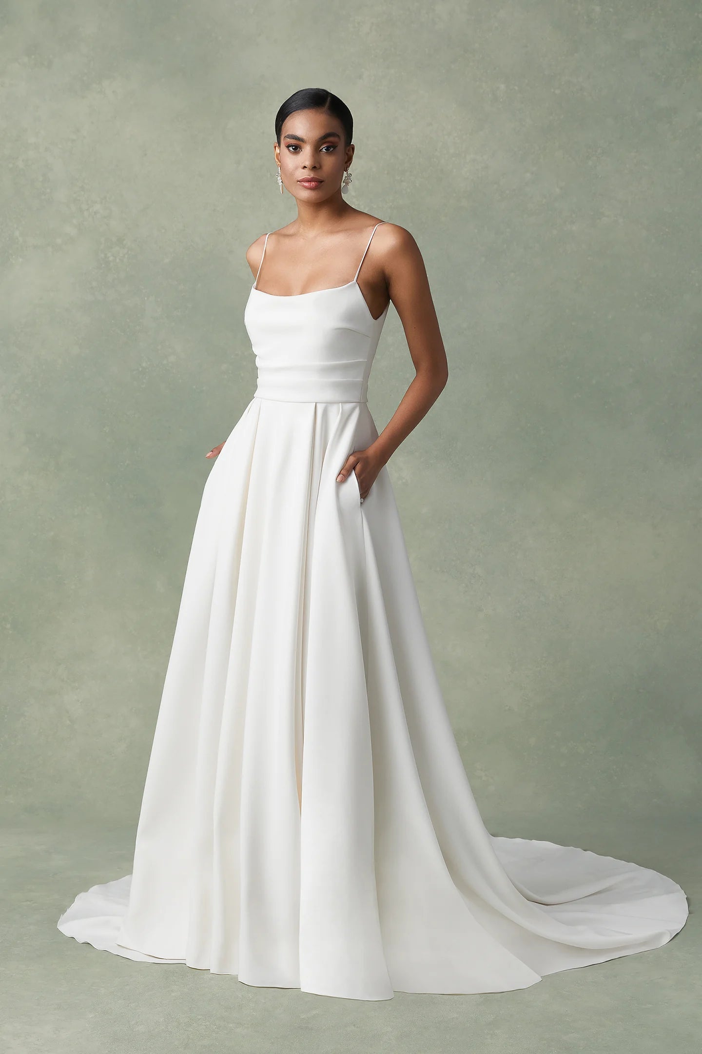 The Frankie gown by Justin Alexander is the definition of effortless modern romance. Crafted in the brand’s signature luxe crepe, this sleek silhouette skims the figure with precision tailoring that flatters from every angle. A clean, sculpted bodice with subtle seaming highlights the waist, while the fitted skirt flows into a dramatic chapel-length train for a moment of pure bridal elegance.