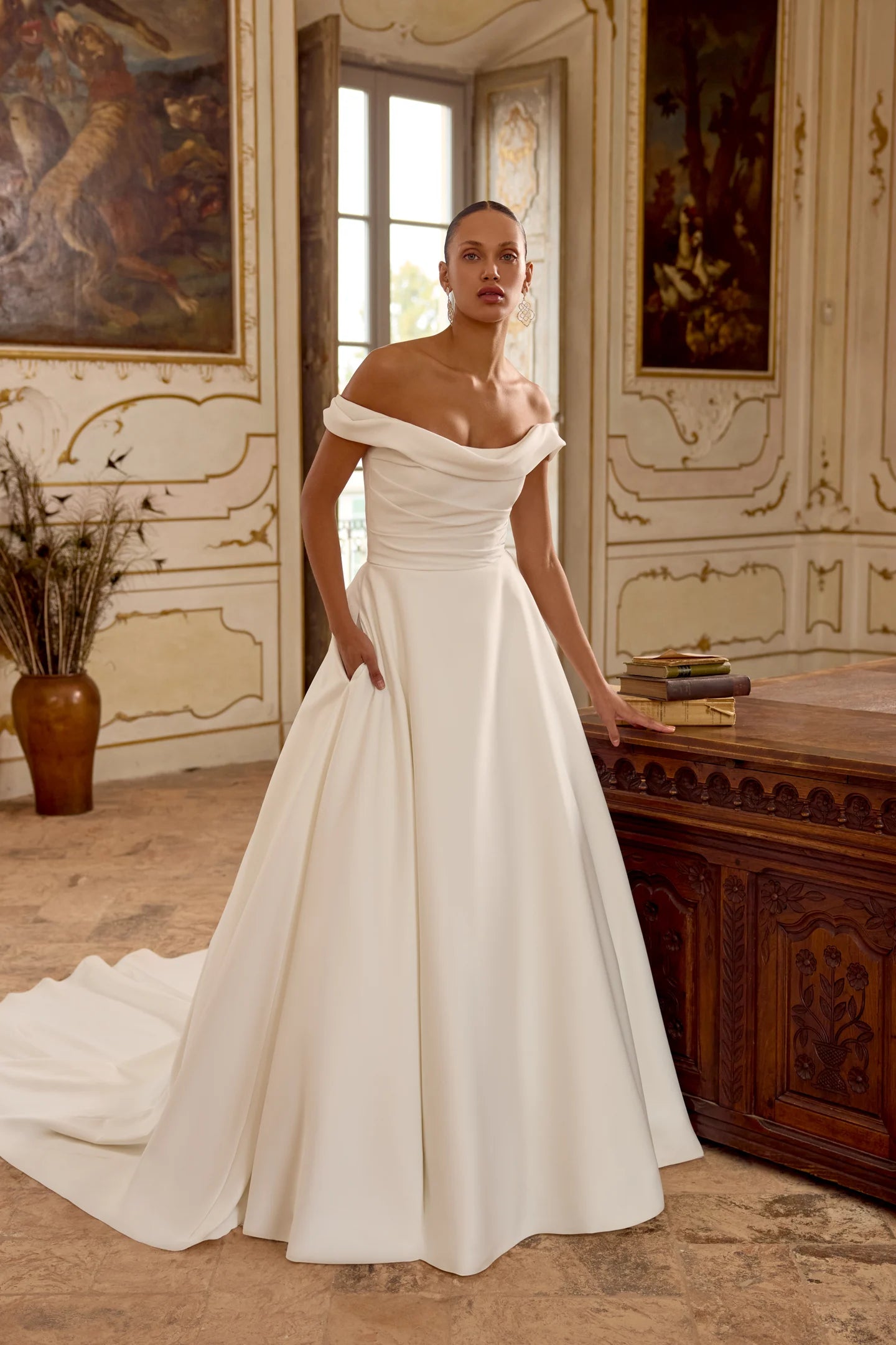 Kelly is the ultimate expression of quiet power in a wedding dress classic in structure yet modern in impact. The off the shoulder neckline offers sophistication and poise, while the luxurious satin skirt brings refined glamour. For the bride seeking timeless style with a modern twist, Kelly is unforgettable.