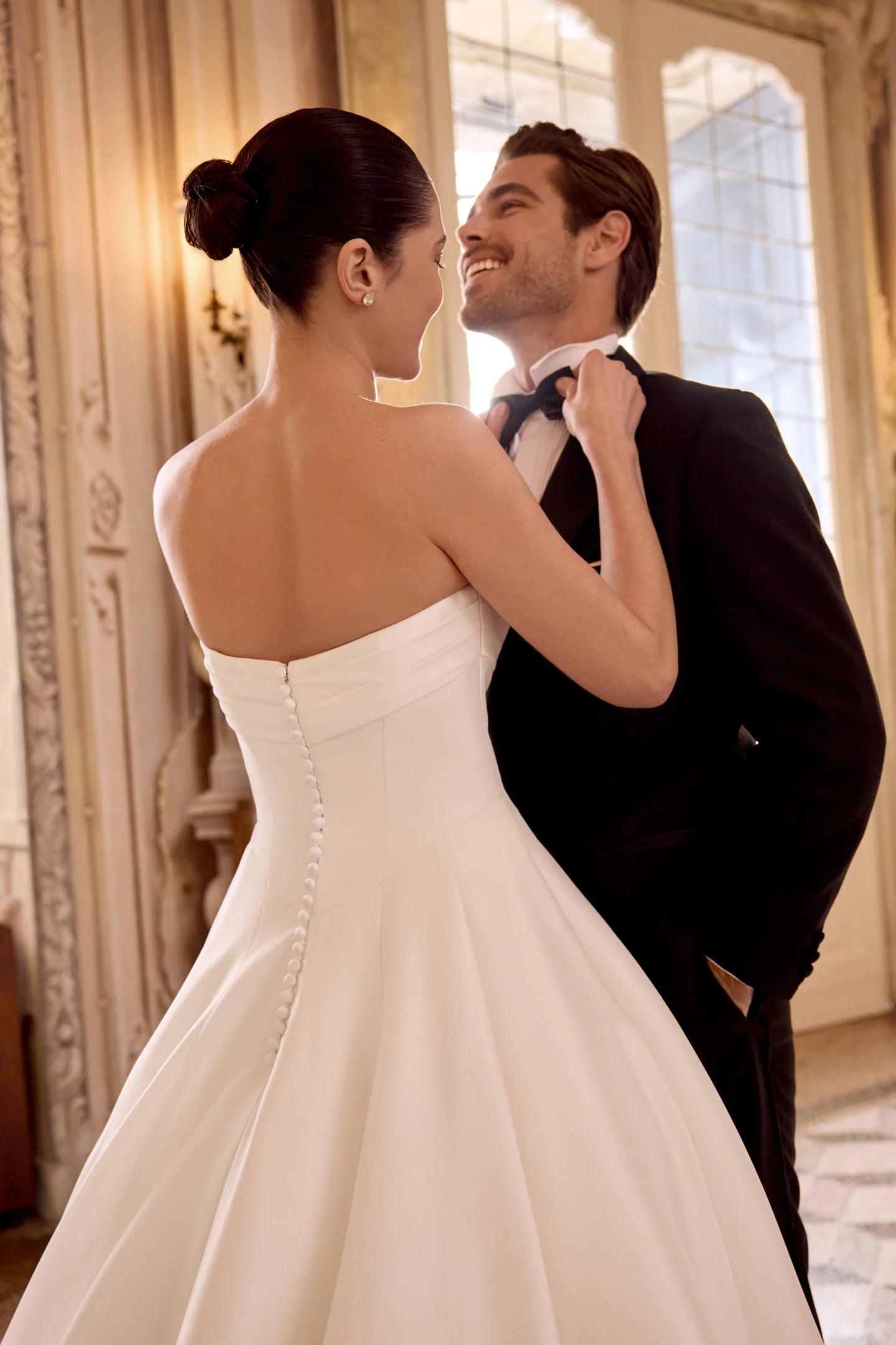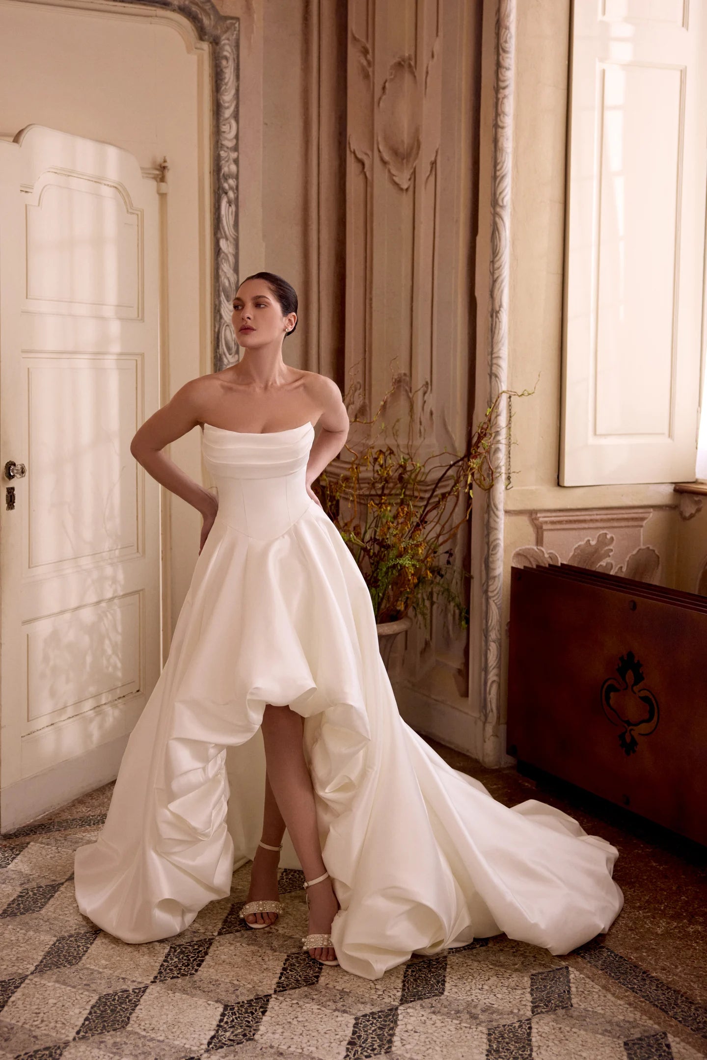 Bold, feminine, and beautifully contemporary, the Lottie gown by Justin Alexander is a true showstopper for the modern bride. Crafted in luminous mikado, this striking strapless gown features a soft scoop neckline, structured bodice, and dramatic high-low skirt that flows into a sweeping chapel-length train.