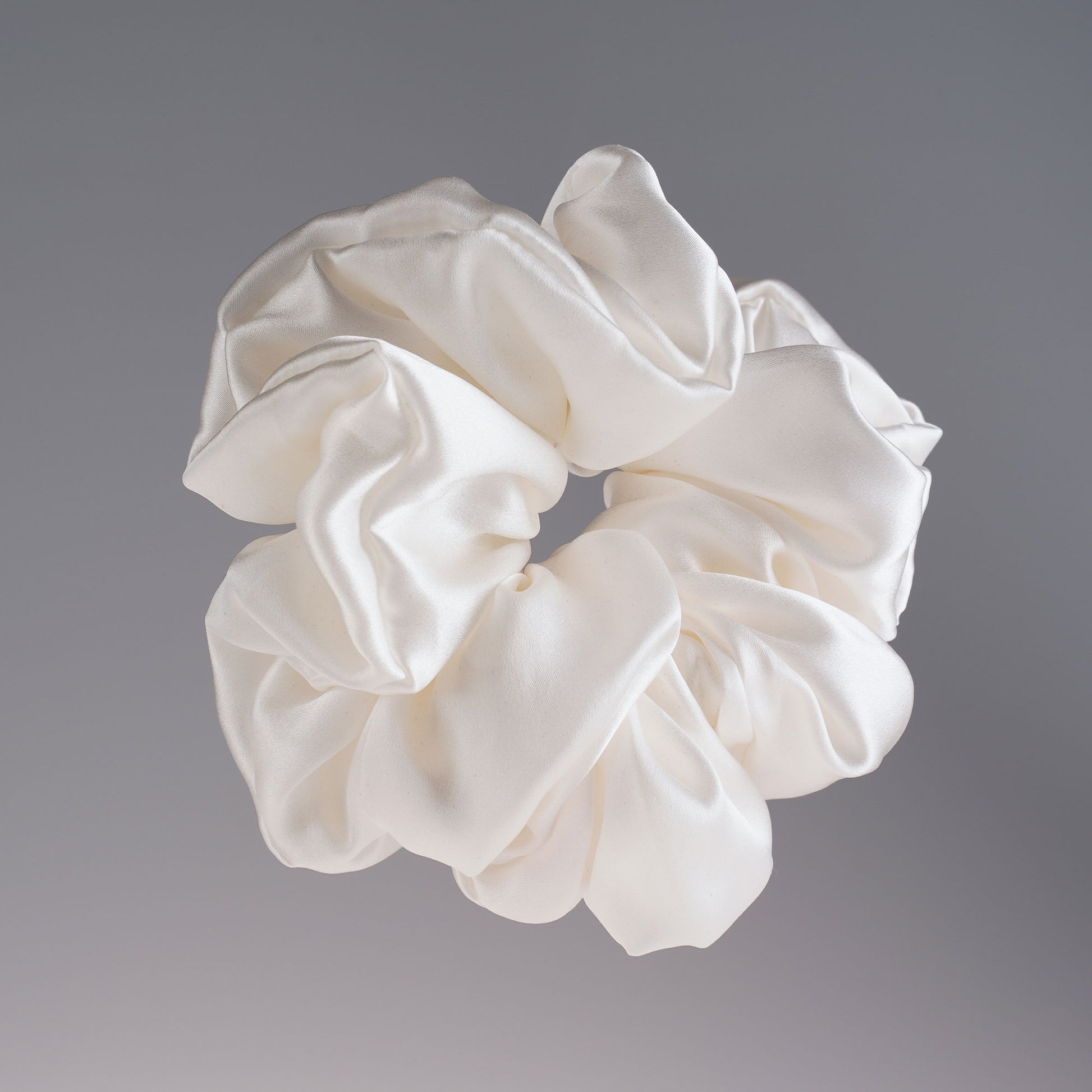 Soft mulberry silk is gathered to create an oversized hair scrunchie. Beautiful for tying the hair into a loose pony for the evening or for a pre-wedding dinners - the choice is yours.