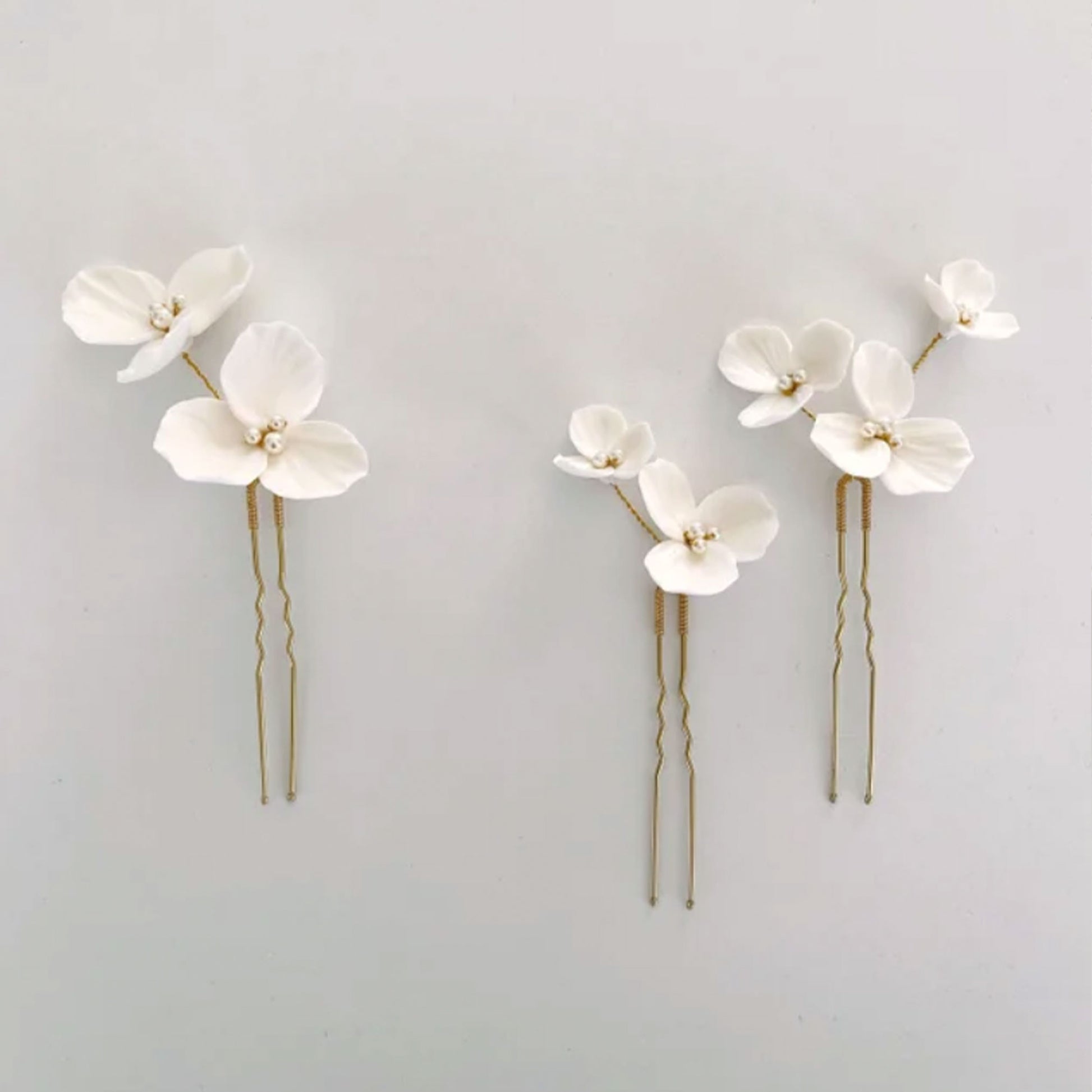 The open, blousy Verona flowers in all their glory. A more delicate addition to your wedding hair, but bold in their individuality. Cluster to one side, or scatter organically.